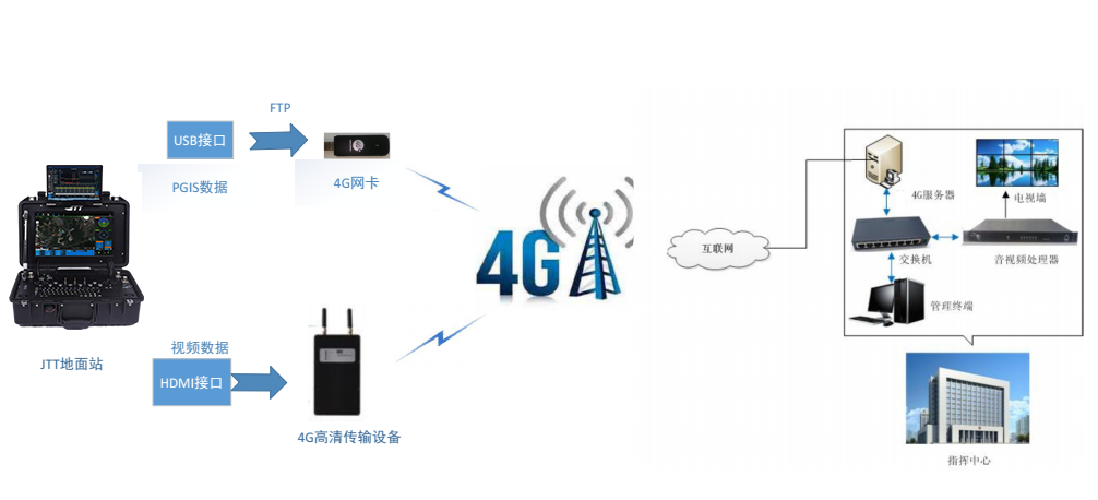 無人機在偵察時高空拍攝到的圖像和視頻以及無人機的坐標、高程信息通過無線通信鏈路傳輸到地面站后,可通過專用有線網絡與現(xiàn)場的移動前置機形成數據通路,也可借助4G網絡把數據輸入到內網的數據庫中并連通到應急指揮調度平臺。通過這種方式,現(xiàn)場的第一手資料與龐大的數據庫之間就形成了協(xié)同作戰(zhàn)的態(tài)勢。無論是領導指揮還是第一線巡檢人員的具體執(zhí)行都將得到有力、有效和迅速的信息支撐。