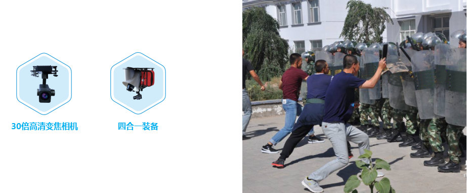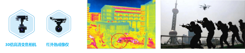 無人機可搭載30倍變焦相機飛抵現(xiàn)場偵察, 并將現(xiàn)場大致情況及時反饋給指揮中心;無人機可實施低空拍攝,將犯罪分子人數、規(guī)模、人員傷亡等情況及時傳回指揮中心,指揮中心根據無人機傳回來的消息,迅速做出決策,對武警特警、救護人員、消防人員等進行合理部署;