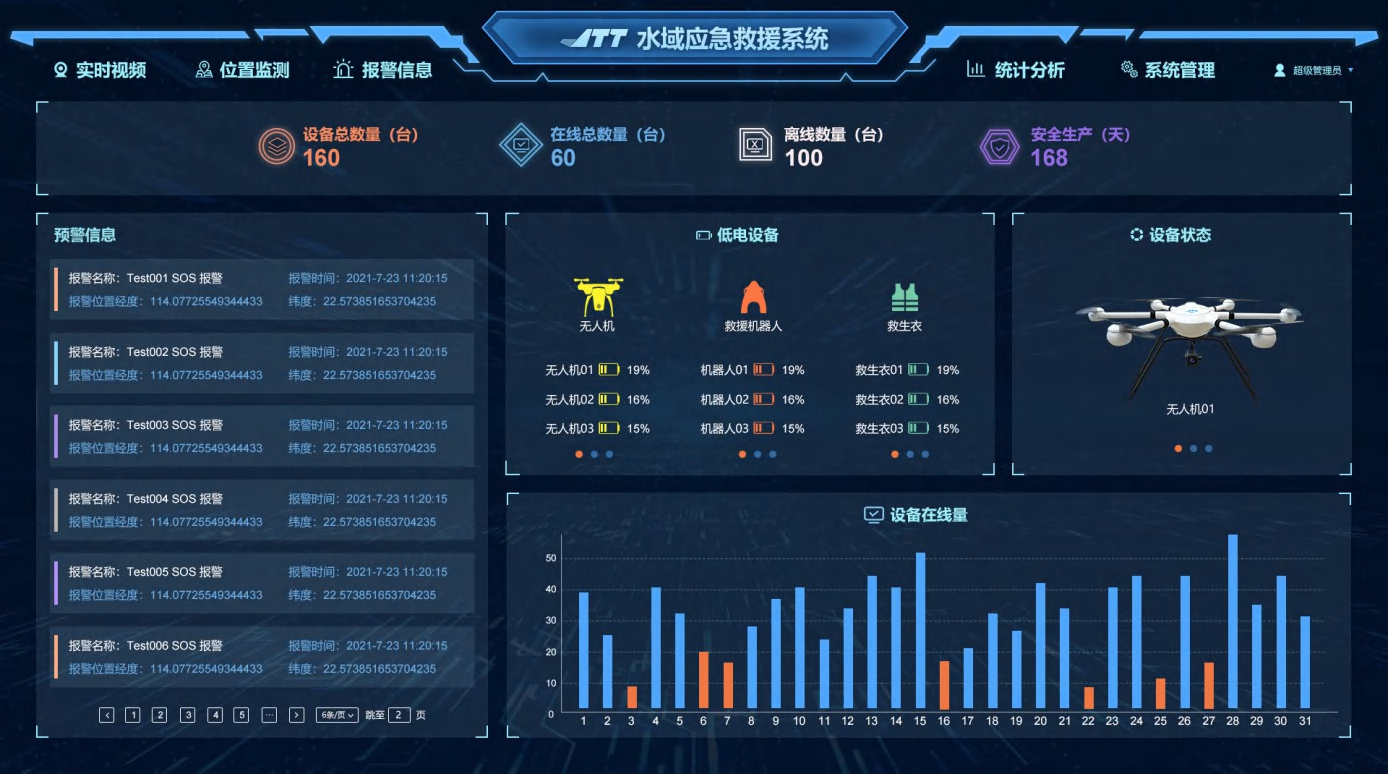 水域應急救援系統(tǒng)采用C/S、B/S混合式、多層系統(tǒng)架構,將水域應急救援系統(tǒng)(空中巡查系統(tǒng),水域救援系統(tǒng),作業(yè)平臺AI安全預警系統(tǒng),救援人員防溺水監(jiān)測系統(tǒng)等)、報警聯(lián)動等全部融合形成統(tǒng)一的平臺系統(tǒng),滿足了水域的應急救援需求,大大降低了系統(tǒng)使用難度、管理效率顯著提升。水域應急救援系統(tǒng)前端救援設備包括水域AI攝像機、救援無人機、水上救援機器人、水上救援艇、智能定位報警救生衣、停機坪、太陽能充電板等,組成空中、水面立體化救援網(wǎng)絡,應對不同的水域救援場景需求。可廣泛應用于抗洪救災、海邊安全保障、水域管理、消防、交通指揮、邊防巡邏、應急管理、部隊、大型保障等。