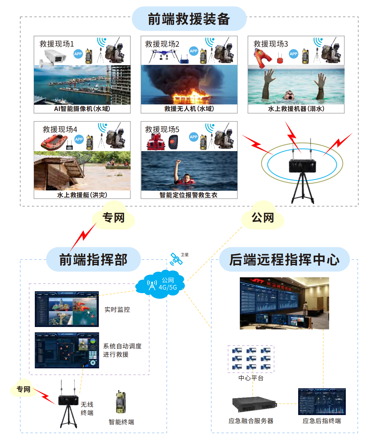 1,據(jù)網(wǎng)絡情況,選公網(wǎng)+專網(wǎng)通信,選指前端指揮部,一線人員進入現(xiàn)場打開現(xiàn)場指揮中心、前端救援裝備,前端(A!智能攝像機、水上救援機器人、水上救援艇、無人機、智能定位報警救生衣等)接入現(xiàn)場指揮中心,現(xiàn)場指揮中心自動接入后端遠程指揮中心;