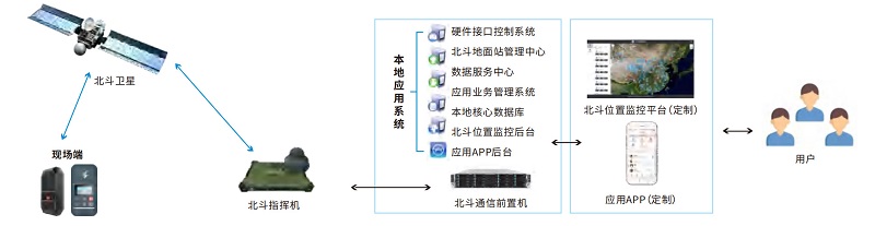 中心端軟硬件系統(tǒng)包括:1-北斗指揮機(jī),2-北斗衛(wèi)星收發(fā)單元,3:本地應(yīng)用系統(tǒng),4-北斗RDSS專用服務(wù)器,5-北斗監(jiān)控平臺(tái)與APP五大部分組成。