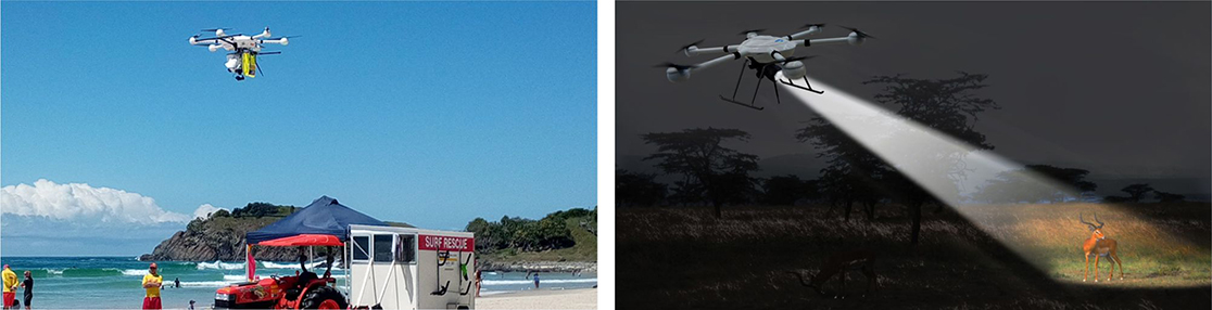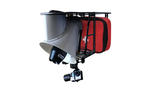 四合一裝備 四合一裝備包括喊話器、高清相機、照明設備、急救包設備。 無線傳話距離可達3公里,實時無線喊話,實時高清圖像監控,遠距離照明并可以投擲急救包。 可在反恐救援、偵查取證、交通監測等中應用。