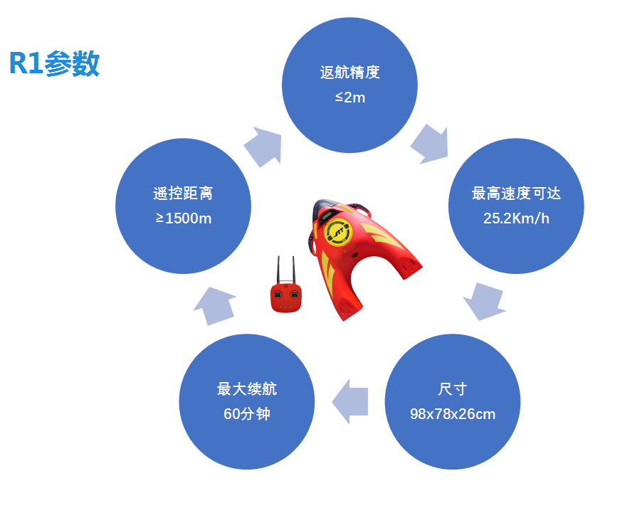 R1水上救援機器人功能特性R1水上救援機器人是政府應急、民間各類水上救援組織的標準救援設備,適用于大海、水庫、江河、湖泊、洪水等水上救援應用場景。全程快速救援:空載航速度高達7m/s,可快速到達落水者身邊進行施救,爭取黃金救援時間。