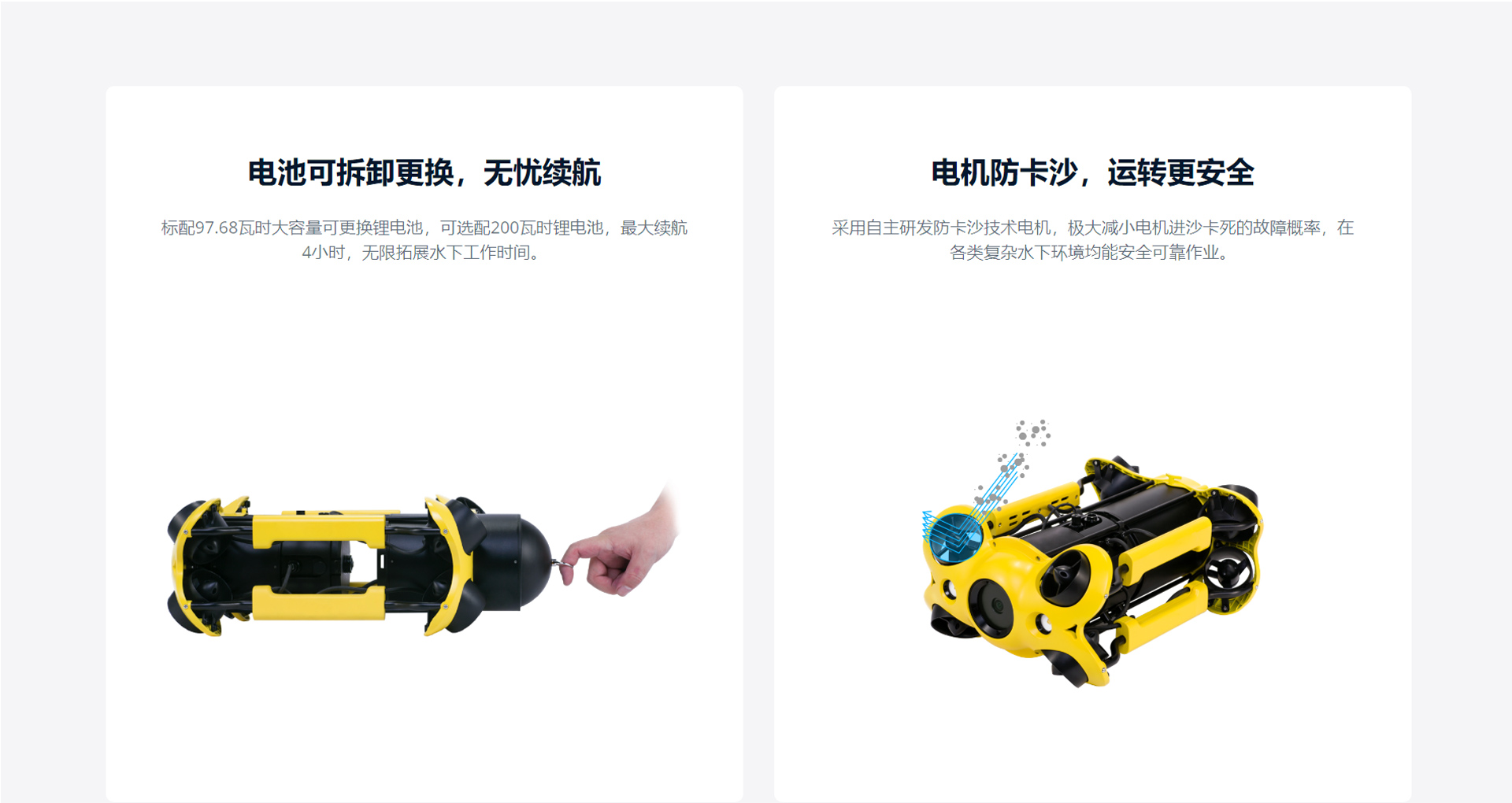 水下運動姿態:360 度全方位全自由度運動,全方向抗流穩定,滿足 6個自由度移動,包括:前進/后退,左轉/右轉,左平移/右平移,上浮/下潛往下俯/往上仰,順時針翻滾/逆時針翻滾