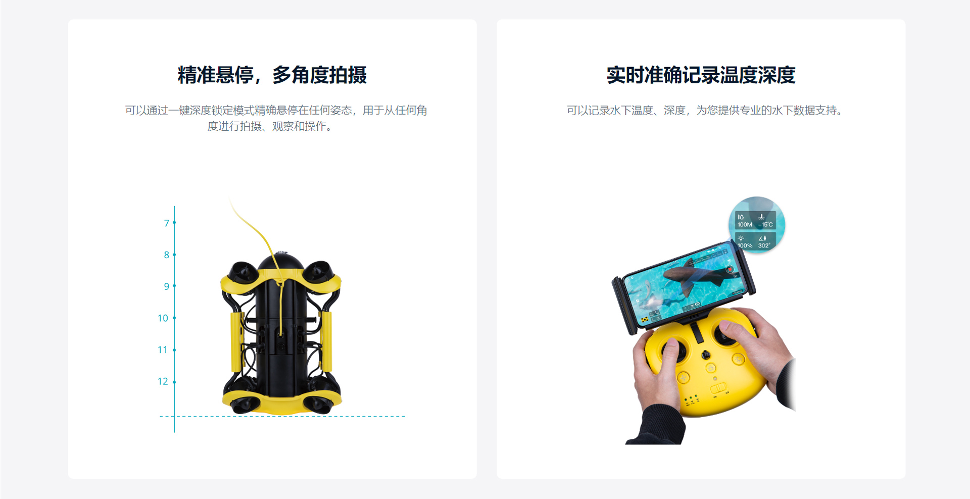 水下運動姿態:360度全方位全自由度運動,全方向抗流穩定,滿足12個自由度移動,包括:前進/后退,左轉/右轉,左平移/右平移,上浮/下潛,往下俯/往上仰,順時針翻滾/逆時針翻滾