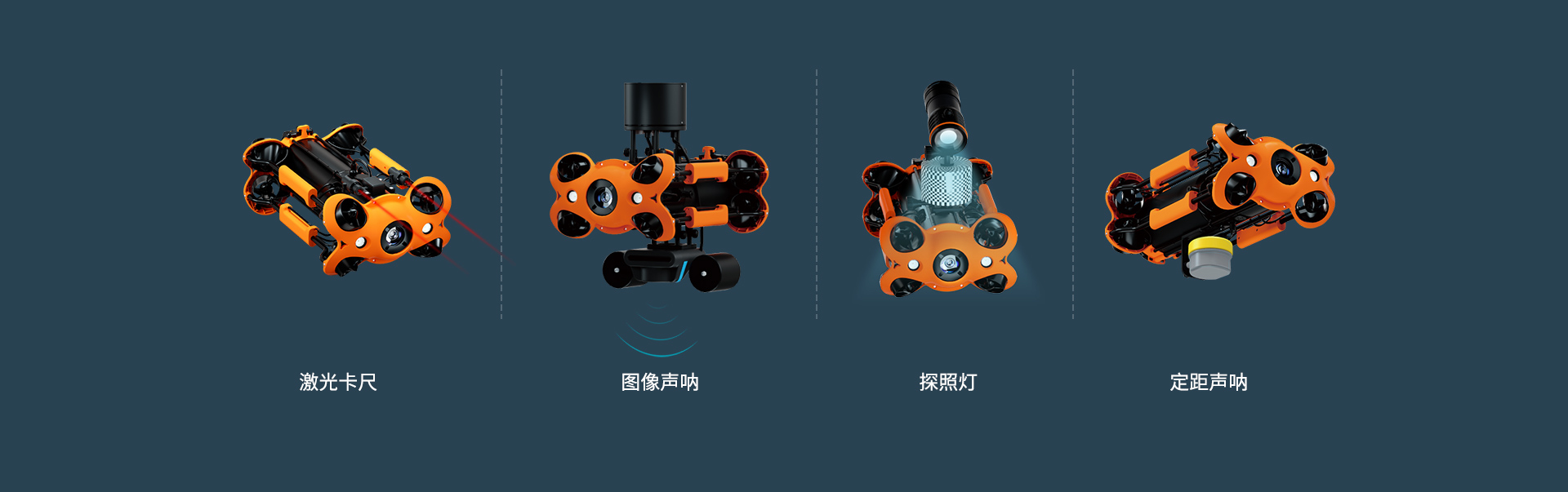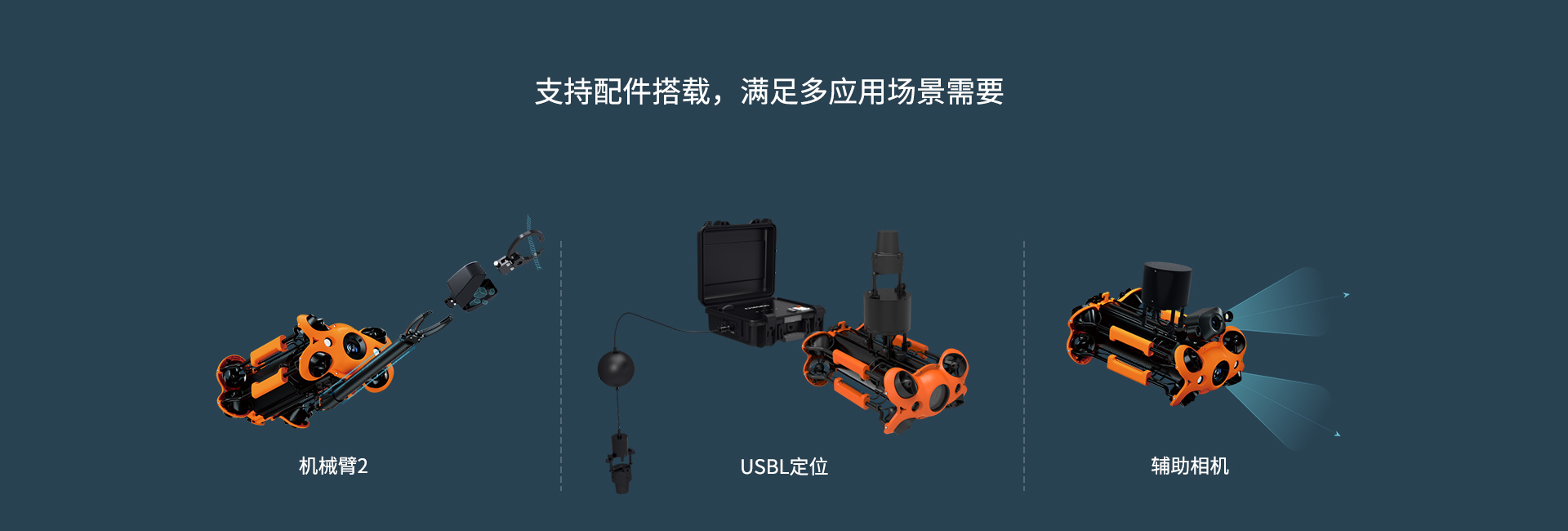 支持配件搭載,滿足多應用場景需要:機械臂,激光卡尺,潛水燈,定距聲吶。
