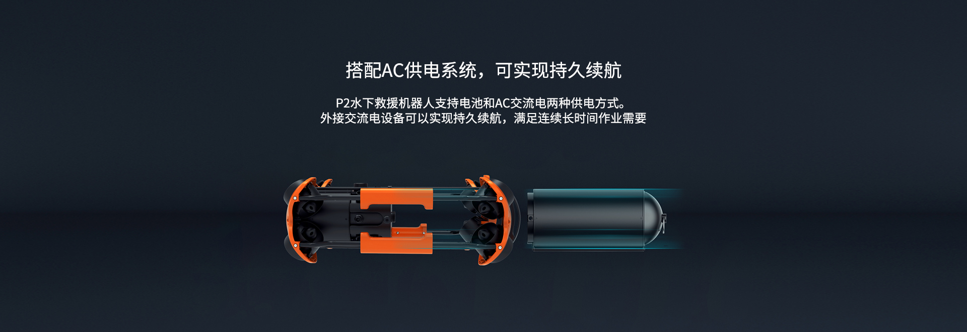 搭配AC供電系統,可實現持久續航:P2水下救援機器人支持電池和AC交流電兩種供電方式。外接交流電設備可以實現持久續航,滿足連續長時間作業需要;