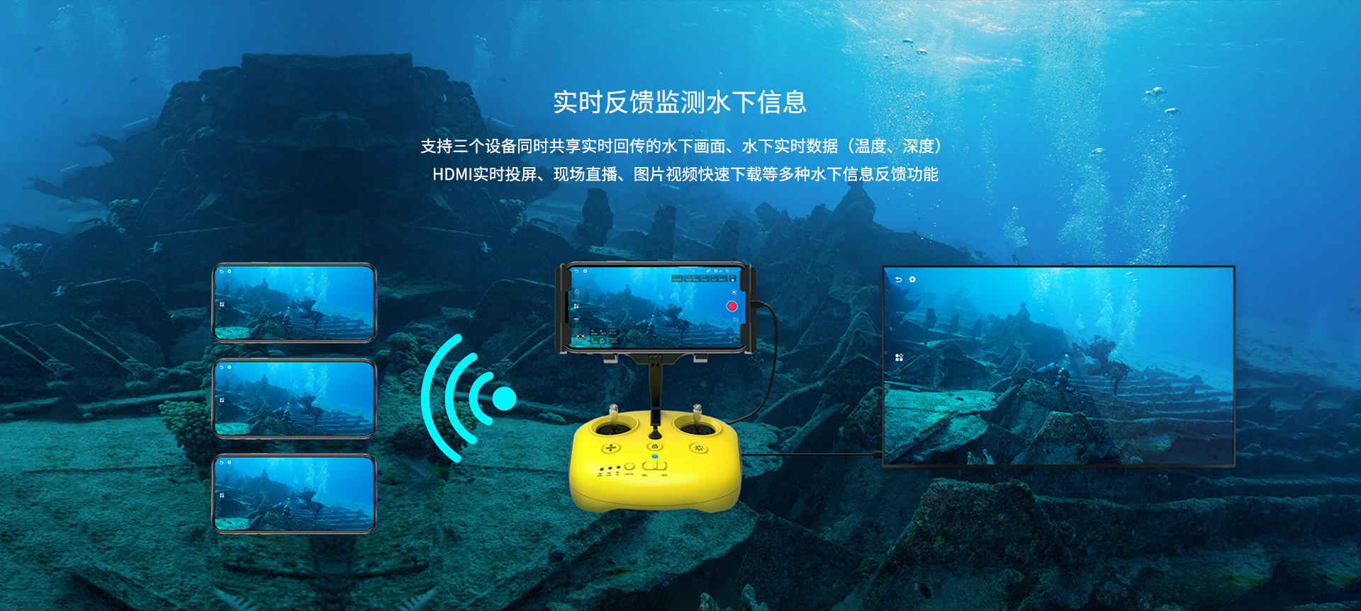 實時反饋監測水下信息:支持三個設備同時共享實時回傳的水下畫面、水下實時數據(溫度、深度)HDMI實時投屏、現場直播、圖片視頻快速下載等多種水下信息反饋功能。