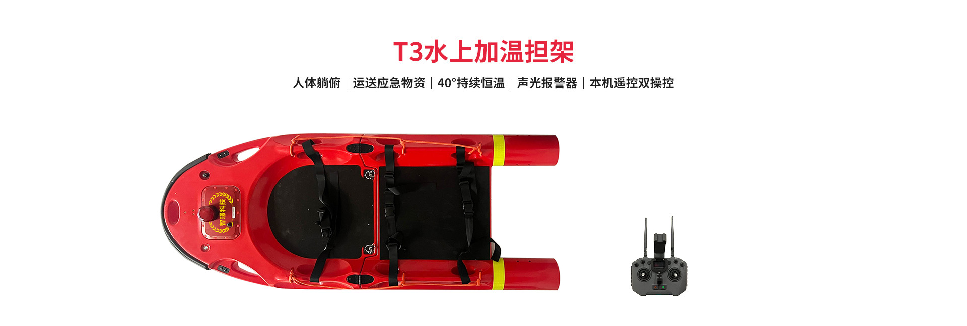 T3水上加溫擔架是一款政府應急、民間各類水上救援組織的標準救援設備,應用于水上應急救生、昏迷者救助、應急物資運送等場景,便于人體躺俯和運送應急物資;遇到險情,無須充氣,直接展開便可投入救援工作中,以6米/秒的速度抵達事發地點,將落水者安全轉移。具備遙控/本機控制模式,遙控端可實時顯示電量、距離等信息;支持加溫功能,在低溫環境下保證傷者體溫,安全有效搶救生命。此外,擔架還配有2條安全綁帶和9個把手,可牢固固定傷者,避免二次傷害;配備聲光報警器,便于夜間、雨霧天氣實施救援。