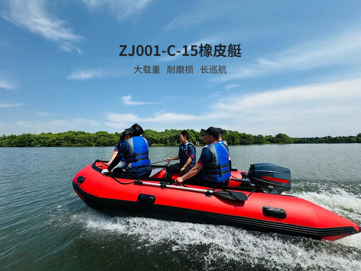 型號:ZJ001-C-15 尺寸:艇長430cm,艇寬195cm 氣囊直徑:50cm 翹首高度:70cm 氣室數量:5個 設計最大載員:9人 設計最大載重:1000kg 設計最大航速40km/h